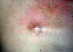 °¡·Á¿òÁõÀÌ ÁÖ Áõ»óÀÌ´Ù. ¸¹ÀÌ ±Ü¾î¼ Áø¹°ÀÌ ³ª°í °¡Çǰ¡ Çü¼ºµÈ °ÍÀ» °¡²û º¼ ¼ö ÀÖÀ¸¸ç 2Â÷ ¼¼±Õ°¨¿°ÀÌ »ý±æ ¼ö ÀÖ´Ù. Å»º¸´Â º¸Åë ³ªÅ¸³ªÁö ¾Ê´Â´Ù. 1~2.7mmÀÇ ¼ºÃæÀ» ¹ß°ßÇϱâ´Â ÈûµéÁö¸¸ 0.3~0.8mmÀÇ ¼Ä³´Â µÎÇÇ¿¡ °¡±õ°Ô ¸ð¹ß¿¡ ºÙ¾îÀÖÀ¸¸ç, ¸ð¹ßÀÌ ¼ºÀÚÇÔ¿¡ µû¶ó ¸»´ÜºÎ·Î À̵¿ÇÏ°í ºñµë°ú ´Þ¸® Àß ¶³¾îÁöÁö ¾Ê´Â´Ù.
