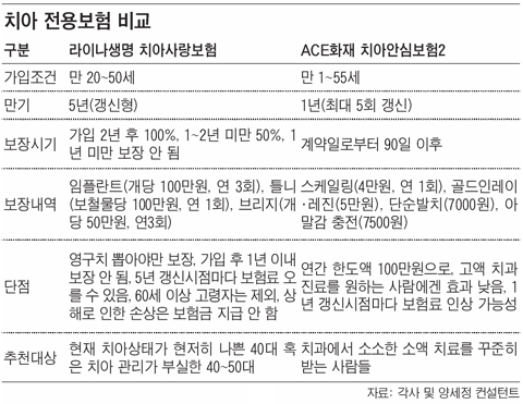 À۳⠸» Ãâ½ÃµÈ ¶óÀ̳ª»ý¸íÀÇ 'Ä¡¾Æ»ç¶ûº¸Çè'Àº ÇÑ´Þ¿¡ 2¸¸~3¸¸¿ø Á¤µµ¸¦ ³»¸é ±¹¹Î°Ç°º¸Çè¿¡¼ Áö¿øÇÏÁö ¾Ê´Â Ä¡°ú Áø·á Áß ÀÓÇöõÆ®¡¤ºê¸®Áö(»ÌÁö ¾ÊÀº ¿· Ä¡¾Æ¸¦ ÀÌ¿ëÇØ ÀΰøÄ¡¾Æ¸¦ ¿¬°áÇÏ´Â °Í)¡¤Æ²´Ï Ä¡·áºñ¸¦ º¸ÀåÇØ ÁØ´Ù. ÀÓÇöõÆ®¿Í Ʋ´Ï´Â 100¸¸¿ø, ºê¸®Áö´Â 50¸¸¿øÀ» Áö¿øÇÑ´Ù. °¡ÀÔ ¿¬·ÉÀº 20~50¼¼À̸ç, 5³â¸¶´Ù º¸Çè·á°¡ ÀÚµ¿ °»½ÅµÈ´Ù. ´Ü °è¾à °»½ÅÀÏÀÌ 55¼¼¶ó¸é ÃÖ´ë 60¼¼±îÁö¸¸ º¸Àå¹Þ´Â´Ù. Ä¡¾Æ ¼Õ»óÀÌ ¸¹Àº ³ë·É±â¿¡´Â º¸Àå¹ÞÀ» ¼ö ¾ø´Â ¼ÀÀÌ´Ù. ¶ÇÇÑ ÀÓÇöõÆ®¿Í ºê¸®Áö´Â ¿µ±¸Ä¡¸¦ »Ì¾Æ¾ß¸¸ º¸Çè±ÝÀÌ ³ª¿Â´Ù. Ʋ´Ï´Â º¸Ã¶¹°´ç Áö±ÞÇϴµ¥ ¿¬ 1ȸ¿¡ ÇÑÇÑ´Ù.