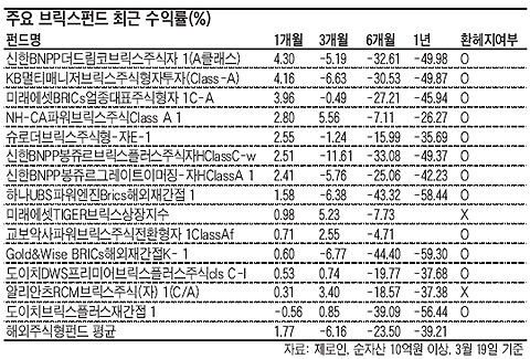 ȯ ÇìÁö¸¦ ÇÑ ºê¸¯½º ÆÝµåÀÇ ÃÖ±Ù 6°³¿ù ¼öÀÍ·üÀÌ ´ëºÎºÐ -30%´ë¿¡ ¸Ó¹°·¯ ÀÖ´Â µ¥ ¹ÝÇØ ȯ ÇìÁö¸¦ ÇÏÁö ¾Ê¾Ò´ø ÆÝµåÀÇ ¼öÀÍ·üÀº -20%¸¦ ³ÑÁö ¾Ê¾Ò´Ù. °³º° ÆÝµå¸¦ »ìÆìºÁµµ ´ëºÎºÐÀÇ ºê¶óÁú ÆÝµåÀÇ ÃÖ±Ù 6°³¿ù ¼öÀÍ·üÀÌ -30%º¸´Ù ³ª»¦´ø µ¥ ¹ÝÇØ ȯ ÇìÁö¸¦ ÇÑ ÆÝµåÀÇ ÃÖ±Ù 6°³¿ù ¼Õ½ÇÀº -15% ³»·Î Á¦ÇѵƴÙ. ÇÏÁö¸¸ ÃÖ±Ù ´Þ·¯È¿¡ ´ëÇÑ ¿øÈ ȯÀ²ÀÌ ±Þ¶ôÇÏ¸é¼ ÃÖ±Ù ÇÑ´Þ ¼öÀÍ·ü¿¡¼ ȯ ÇìÁö¸¦ ÇÑ ÆÝµå ¼öÀÍ·üÀÌ ´õ ³ª¾Ò´Ù. ÀÌ ¶§¹®¿¡ Áõ½Ã Àü¹®°¡µéÀº "ȯ ÇìÁö ¿©ºÎ´Â ÇâÈÄ È¯À²ÀÇ Çâ¹æÀ» ÆÇ´ÜÇØ °áÁ¤ÇØ¾ß ÇÑ´Ù"°í ¸»ÇÑ´Ù.
