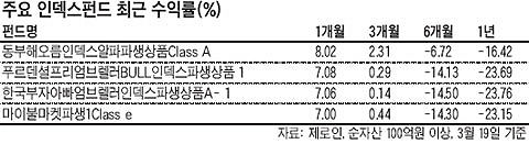ÆÝµåÆò°¡»ç Á¦·ÎÀο¡ µû¸£¸é Áö³ 19ÀÏ ±âÁØÀ¸·Î ÄÚ½ºÇÇ200Áö¼ö ¼öÀÍ·üÀ» ÁÀµµ·Ï ¼³°èµÈ À妽ºÆÝµåÀÇ ÃÖ±Ù 1°³¿ù Æò±Õ ¼öÀÍ·üÀº 6.3%·Î ±¹³» ÁÖ½ÄÇüÆÝµå Æò±ÕÀÎ 4.96%º¸´Ù ³ô¾Ò´Ù. ÇÏÁö¸¸ ÃÖ±Ù 3°³¿ù°ú 6°³¿ù Æò±Õ ¼öÀÍ·üÀº ÀÏ¹Ý ÁÖ½ÄÇüÆÝµå°¡ À妽ºÆÝµå¿¡ ºñÇØ 0.5~1.2%Æ÷ÀÎÆ® Á¤µµ ³ô¾Ò°í, ÃÖ±Ù 1³â ¼öÀÍ·üÀº À妽ºÆÝµå°¡ 2%Æ÷ÀÎÆ® Á¤µµ ³ôÀº -22.89%¸¦ ±â·ÏÇÑ °ÍÀ¸·Î Áý°èµÆ´Ù.