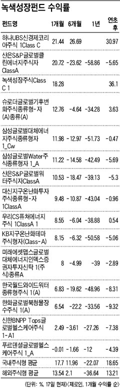 ÀÌó·³ ³ì»öÆÝµå°¡ Áõ°¡ÇÏ´Â ÀÌÀ¯´Â Áõ½Ã¿¡¼ °ü·Ã Å׸¶ÁÖµéÀÌ ±Þµî¼¼¸¦ º¸À̰í Àֱ⠶§¹®ÀÌ´Ù. Á¤ºÎÀÇ ³ì»ö´ºµôÁ¤Ã¥µµ ºÐÀ§±â¸¦ ¶ç¿ü´Ù. dz·ÂºÎǰ¡¤LED»ý»ê±â¾÷ µîÀ» Áß½ÉÀ¸·Î ÁÖ°¡°¡ Å©°Ô´Â ¼ö¹é%¾¿ ¿Ã¶ú´Ù. À̵é ÁֽĿ¡ ÅõÀÚÇÏ´Â ÆÝµå´Â ¼öÀÍ·üÀÌ ±ÞµîÇß´Ù. À۳⠸» ±¹³» óÀ½À¸·Î ¼³Á¤µÈ Èï±¹¿î¿ëÀÇ '³ì»ö¼ºÀåÁÖ½ÄClassC1' ÆÝµåÀÇ ¿¬ÃÊ ÀÌÈÄ ¼öÀÍ·üÀº 36.1%¿¡ ´ÞÇß´Ù. ÇϳªUBS¿î¿ëÀÇ 'ÇϳªUBS½Å°æÁ¦ÄÚ¸®¾ÆÁÖ½Ä1ClassC' ¿ª½Ã ¿¬ÃÊ ÀÌÈÄ 30.97%ÀÇ ¼öÀÍ·ü·Î °°Àº ±â°£ ±¹³»ÁÖ½ÄÇüÆÝµåÀÇ Æò±Õ¼öÀÍ·ü(18.65%)À» Å©°Ô ¿ôµ¹¾Ò´Ù. À̰è¿õ ±Â¸ð´×½ÅÇÑÁõ±Ç ÆÝµå¾Ö³Î¸®½ºÆ®´Â "¼¼°è °¢±¹ÀÌ ³ì»ö¼ºÀå»ê¾÷À» °æ±âºÎ¾ç ¹× ¼ºÀåÀÇ Çٽɻç¾÷À¸·Î ²Å°í ÀÖ´Â ¸¸Å ÁßÀå±âÀûÀ¸·Î ÅõÀÚ°¡ À¯¸ÁÇÏ´Ù°í º»´Ù"°í ¹àÇû´Ù.