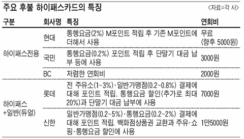 ÈÄºÒ ÇÏÀÌÆÐ½ºÄ«µå(ÀÌÇÏ 'ÈĺÒÄ«µå')´Â ±âÁ¸ ½Å¿ëÄ«µå¿Í ¿¬°èÇØ Ãß°¡·Î ¹ß±Þ¹Þ´Â Àü¿ëÄ«µå°¡ ±âº»ÀÌ´Ù. Àü¿ëÄ«µå´Â Â÷·®¿ë ´Ü¸»±â¿¡ ²È¾Æ¼ »ç¿ëÇϱ⠶§¹®¿¡ °¡¸ÍÁ¡ °áÁ¦±â´ÉÀÌ ¾ø´Ù. 2ÀåÂ¥¸® 'µà¾ó(dual)Ä«µå'´Â Àü¿ëÄ«µå¿Í ÀϹÝÄ«µå(½Å±Ô)¸¦ µ¿½Ã¿¡ ¹ß±Þ¹Þ´Âµ¥, ÀϹÝÄ«µå ¿¬È¸ºñ¸¦ µû·Î ³»´Â ´ë½Å ÇýÅÃÀÌ ¸¹´Ù. µÎ °¡Áö ¹æ½Ä ¸ðµÎ Àü±¹ 453°³ °í¼Óµµ·Î(20§° ¹Ì¸¸ ±¸°£)¿¡¼ ¿ÀÀü 5~9½Ã¿Í ¿ÀÈÄ 6~10½Ã ÅëÇà¿ä±ÝÀÇ 20%°¡ ÇÒÀεǸç(ÀϺΠ½Ã°£´ë¡¤Æ¯Á¤ Â÷·®Àº ÃÖ°í 50%), ¿¬¸»±îÁö´Â Æò½Ãµµ 5% ÇÒÀεȴÙ.