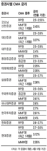 À۳⠸»±îÁö¸¸ ÇØµµ CMA ±Ý¸®´Â ´ëü·Î ¿¬ 5%´ë¸¦ ³ªÅ¸³Â´Ù. ÇÏÁö¸¸ Á¤ºÎÀÇ Áö¼ÓÀûÀÎ ±Ý¸® ÀÎÇÏ·Î CMA ±Ý¸®µµ ²ÙÁØÈ÷ ³»·Á°¡ ÇöÀç´Â °¡Àå ÀϹÝÀûÀÎ ÇüÅÂÀÎ RPÇü CMA ±Ý¸®°¡ ¿¬ 2.5% ¾ÈÆÆÀ» ±â·ÏÇϰí ÀÖ´Ù. ÀºÇà Á¤±â¿¹±Ý ±Ý¸®°¡ ¿¬ 3%´ëÀÓÀ» °¨¾ÈÇÏ¸é ´çÀå ÇÊ¿äÇÑ µ·ÀÌ ¾Æ´Ï¶ó¸é CMAº¸´Ù ÀºÇà¿¡ ¸Ã°ÜµÎ´Â ÆíÀÌ ³´´Ù. ´ë½Å ÆÝµåÆò°¡»ç