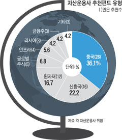 ´ÙÀ½À¸·Î Áß±¹, ºê¸¯½º(BRICs), ¿øÀÚÀçºÐ¾ßÀÇ ´ëÇ¥ ÆÝµåµéÀÌ ¸¹Àº ÃßõÀ» ¹Þ¾Ò´Ù. Àϸí '¹ÌÂ÷¼Ö'·Î ºÒ¸®´Â ¹Ì·¡¿¡¼ÂÀÚ»ê¿î¿ëÀÇ '¹Ì·¡¿¡¼ÂÂ÷À̳ª¼Ö·Î¸óÁõ±ÇÅõÀÚ½ÅŹ'Àº ÇѶ§ Áß±¹ÆÝµåÀÇ ´ë¸í»ç·Î ºÒ¸° ÆÝµå·Î Àüü ¼³Á¤¾×ÀÌ 4Á¶¿øÀ» ³Ñ´Â´Ù. PCA ChinaDragonÆÝµå¿Í ´Þ¸® È«Äá HÁõ½Ã¿¡ ÁÖ·Î ÅõÀÚÇϰí, ȯ ÇìÁö ºñÀ²ÀÌ 90% ³»¿Ü¸¦ À¯ÁöÇÒ Á¤µµ·Î ³ô´Ù´Â Á¡ÀÌ Æ¯Â¡ÀÌ´Ù. µ¿¾çÁõ±Ç ±èÈÄÁ¤ ¿¬±¸¿øÀº "ȯ ÇìÁö ºñÀ²ÀÌ ³ô±â ¶§¹®¿¡ ¿øÈ °¼¼ ½Ã ¼öÇý°¡ ¿¹»óµÈ´Ù"¸ç "ÇÑÆí º¯µ¿¼ºÀÌ Å« ÀÎÅͳݾ÷Á¾ÀÇ ÅõÀÚºñÁßÀÌ Å©´Ù´Â Á¡À» ¿°µÎ¿¡ µÑ Çʿ䰡 ÀÖ´Ù"°í ¸»Çß´Ù.