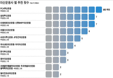 ±¹³» ¿î¿ë»ç Áß¿¡¼´Â »ï¼ºÅõ½Å¿î¿ëÀÌ 5°³ÀÇ ÆÝµå¿¡ ´ëÇØ 7¹øÀÇ ÃßõÀ» ¹Þ¾Æ Ãßõ ¼ö°¡ °¡Àå ¸¹¾Ò°í ¹Ì·¡¿¡¼ÂÀÚ»ê¿î¿ëÀÌ '¹ÌÂ÷¼Ö'À» ºñ·ÔÇÑ 4°³ÀÇ ÆÝµå·Î ¿ª½Ã 7¹øÀÇ ÃßõÀ» ¹Þ¾Ò´Ù. Çǵ¨¸®Æ¼ÀÚ»ê¿î¿ëÀº º¹¼öÀÇ ÃßõÀ» ¹ÞÀº ÆÝµå°¡ ¾ø¾úÁö¸¸ 6°³ÀÇ ÆÝµå°¡ °¢°¢ 1¹ø¾¿ ÃßõÀ» ¹Þ¾Æ Ãßõ ÆÝµå ¼ö´Â °¡Àå ¸¹¾Ò´Ù.