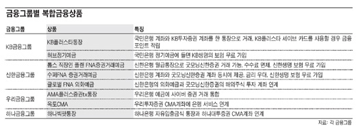 º¹ÇÕ±ÝÀ¶»óǰÀÌ Àα⸦ ²ø°í ÀÖ´Ù. º¹ÇÕ±ÝÀ¶»óǰÀº ¿¹±Ý°ú ÁÖ½Ä °Å·¡, ¿¹±Ý°ú º¸Çè, ÆÝµå °Å·¡¿Í Ä«µå µî ¼·Î ´Ù¸¥ ¿µ¿ªÀÇ ±ÝÀ¶ »óǰÀ» ÇϳªÀÇ ±ÝÀ¶ »óǰÀ¸·Î ¼¯Àº °ÍÀÌ´Ù. ƯÈ÷ ÀºÇࡤīµå»ç¡¤º¸Çè»ç µîÀÌ ÁöÁÖȸ»çÀÇ ¿ì»ê ¾Æ·¡ ¸ðÀÌ¸é¼ ±ÝÀ¶±×·ìº°·Î ´Ù¾çÇÑ »óǰµéÀÌ Ãâ½ÃµÇ°í ÀÖ´Ù. °í°´µé·Î¼´Â º¹ÇÕ±ÝÀ¶»óǰÀ» ÀÌ¿ëÇÏ¸é ¿ù±Þ ÅëÀå¿¡ µé¾î¿Â µ·À» Áõ±Ç °èÁ·ΠÀÌü½ÃŰ´Â µîÀÇ ¼ö°í¸¦ ´ú ¼ö ÀÖ°í, ±Ý¸®³ª ¼ö¼ö·á µî¿¡¼ ¿ì´ë ÇýÅÃÀ» ¹ÞÀ» ¼ö ÀÖ¾î ÀÌÁ¡ÀÌ ÀÖ´Ù. ÇÏÁö¸¸ ¼·Î ´Ù¸¥ ±ÝÀ¶ »óǰÀ» ¼¯´Ù º¸´Ï °í°´ÀÌ ½±°Ô ÀÌÇØÇϱ⠾î·Á¿î Á¡µµ ÀÖ´Ù.