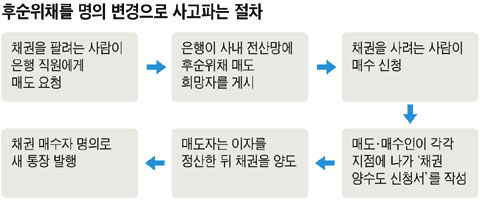 ÇÏÁö¸¸ ¸¸±â±îÁö µ·ÀÌ ²Ä¦¾øÀÌ ¹¿© ÀÖ¾î¾ß¸¸ ÇÏ´Â °Ç ¾Æ´Ï´Ù. °Å·¡ÀºÇà ⱸ¸¦ ÅëÇØ °³ÀÎ °£¿¡ ÈļøÀ§Ã¤¸¦ »ç°íÆÄ´Â ¹æ¹ýµµ ÀÖ´Ù. ±ÞÇÏ°Ô Çö±ÝÀÌ ÇÊ¿äÇÑ ÈļøÀ§Ã¤ °¡ÀÔÀÚ´Â ÀºÇà Á÷¿ø¿¡°Ô ÈļøÀ§Ã¤¸¦ ÆÈ°í ½Í´Ù´Â Àǻ縦 ¹àÈ÷¸é µÈ´Ù. ¹Ý´ë·Î µÚ´Ê°Ô ÈļøÀ§Ã¤¸¦ »ç°í ½ÍÀº ÅõÀÚÀÚ¶ó¸é, ÀºÇà Á÷¿ø¿¡°Ô ÈļøÀ§Ã¤¸¦ ÆÈ »ç¶÷ÀÌ ÀÖ´ÂÁö¸¦ ¹°¾îº¸°í, ¸Å¹°ÀÌ ³ª¿À´Â Áï½Ã ¿¬¶ôÇØ ´Þ¶ó°í ºÎŹÇÏ¸é µÈ´Ù. ±Ý¾× µî Á¶°ÇÀÌ ºÎÇյǴ ¸Å¼ö¡¤¸Åµµ Èñ¸ÁÀÚ°¡ ³ª¿À¸é, ÀºÇà Áß°³ ÇÏ¿¡ ¸íÀǺ¯°æ ÀýÂ÷°¡ ½ÃÀ۵ȴÙ. ¸Å¼ö¡¤¸ÅµµÀÎÀº °¢°¢ °Å·¡ÇÏ´Â ÁöÁ¡¿¡ ³ª°¡ 'ä±Ç¾ç¼öµµ ½Åû¼'¸¦ ÀÛ¼ºÇϰí, ÀºÇàÀº ÈļøÀ§Ã¤ ¸ÅµµÀο¡°Ô ¼¼±ÝÀ» °øÁ¦ÇÑ ÀÌÀÚ¸¦ Áö±ÞÇϰí ÈļøÀ§Ã¤ ÅëÀåÀ» ȸ¼öÇÑ´Ù. ±×¸®°í ÈļøÀ§Ã¤ ¸Å¼öÀÎÀº »õ ÅëÀåÀ» ¹ß±Þ¹Þ´Â´Ù.