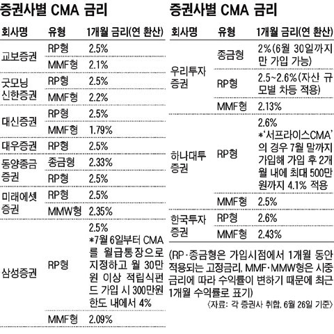 »ï¼ºÁõ±Çµµ ¿À´Â 7¿ù 6ÀϺÎÅÍ ÃÖ´ë ¿¬ 4%ÀÇ ±Ý¸®¸¦ º¸ÀåÇÏ´Â CMA¸¦ ÆÇ¸ÅÇÑ´Ù. ÀÌ »óǰÀº Á» ´õ Á¶°ÇÀÌ ±î´Ù·Ó´Ù. ¿ì¼± ÀÌ CMA »óǰÀ» ¿ù±Þ ÅëÀåÀ¸·Î ÁöÁ¤ÇÏ°í ¿ù 30¸¸¿ø ÀÌ»ó Àû¸³½Ä ÆÝµå¿¡ ÀÚµ¿ÀÌü¸¦ ÅëÇØ °¡ÀÔÇØ¾ß ÇÑ´Ù. ¶Ç 4% ±Ý¸® ÇýÅÃÀ» ¹ÞÀ» ¼ö ÀÖ´Â Çѵµµµ 300¸¸¿ø±îÁö´Ù. Çѵµ¸¦ ÃʰúÇÏ´Â ±Ý¾×Àº ±âÁ¸ÀÇ CMA¿Í ¸¶Âù°¡Áö·Î ¿¬ 2.5%ÀÇ ±Ý¸®¸¦ Àû¿ë¹Þ´Â´Ù.