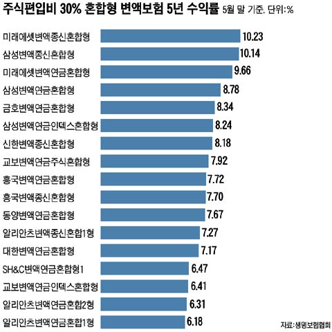 º»Áö°¡ »ý¸íº¸ÇèÇùȸ ȨÆäÀÌÁö¸¦ ÅëÇØ Ãâ½ÃµÈ Áö 5³â ÀÌ»ó µÈ ÁÖ¿ä º¯¾×º¸Çè(È¥ÇÕÇü) ¼öÀÍ·üÀ» Á¶»çÇÑ °á°ú, ä±Ç¿¡ 70%, ÁֽĿ¡ 30%¸¦ ÅõÀÚÇÏ´Â 17°³ º¯¾×º¸ÇèÀÌ Áö³ 5³â°£ ¿¬Æò±Õ 7.9%ÀÇ ¼öÀÍ·üÀ» ±â·ÏÇÑ °ÍÀ¸·Î ³ªÅ¸³µ´Ù. ¿¬Æò±Õ 8% ÀÌ»ó ¼öÀÍÀ» ¿Ã¸° º¸ÇèÀÌ 7°³, ¿¬ 7~8%°¡ 6°³, ¿¬ 6~7%°¡ 4°³¿´À¸¸ç, ¿¬ 6% ÀÌÇÏ´Â ¾ø¾ú´Ù.