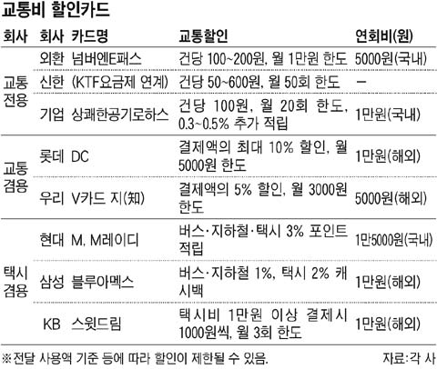 ±³Åëºñ ÇÒÀÎÀº ´ë°³ ¹ö½º¡¤ÁöÇÏö ¿ä±Ý¿¡¼ 100¿øÀ» ÇÒÀÎÇØ ÁÖÁö¸¸, ÀϺ°¡¤¿ùº° Á¦ÇÑÀÌ ÃµÂ÷¸¸º°ÀÌ´Ù. ¶Ç ±³ÅëÇÒÀÎÀ» ÁÖ(ñ«) ¸ñÀûÀ¸·Î ÇÏ´Â ´ë½Å ´Ù¸¥ ºÎ°¡¼ºñ½º°¡ ÀûÀº Ä«µå°¡ Àִ°¡ Çϸé, ºÎ°¡¼ºñ½º°¡ ÁÁ°í ±³ÅëÇÒÀÎ ÇýÅÃÀº ÀûÀº Ä«µåµµ ÀÖ´Ù.