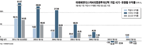 ¹Ì·¡¿¡¼ÂÀÚ»ê¿î¿ëÀÇ '¹Ì·¡¿¡¼Âµð½ºÄ¿¹ö¸®Áõ±ÇÅõÀÚ½ÅŹ'À» ¿¹·Î µé¾îº¸ÀÚ. ÀÛ³â 7¿ù°ú ÀçÀÛ³â 7¿ù¿¡ Àû¸³½ÄÀ¸·Î °¡ÀÔÇÑ ÅõÀÚÀÚÀÇ ¼öÀÍ·üÀº °¢°¢ 13.03%, -1.95%´Ù. ÀÌ¿¡ ºñÇØ °°Àº ½Ã±â¿¡ °ÅÄ¡½ÄÀ¸·Î ÅõÀÚÇß´Ù¸é ÇöÀç °¢°¢ -3.6%, -10.78%¸¦ ±â·Ï ÁßÀÌ´Ù. ÇÏÁö¸¸ °¡ÀÔ ±â°£ÀÌ 3³â ÀÌ»óÀ¸·Î ´Ã¾î³ª¸é »óȲÀº ´Þ¶óÁø´Ù. 2006³â 7¿ù¿¡ °¡ÀÔÇßÀ» °æ¿ì Àû¸³½Ä°ú °ÅÄ¡½ÄÀÇ ¼öÀÍ·üÀÌ °¢°¢ 8.15%, 46.3%·Î ¿ªÀüµÆ°í, ±â°£ÀÌ ´õ ±æ¾îÁú¼ö·Ï ¼öÀÍ·ü °ÝÂ÷´Â °ÅÄ¡½Ä¿¡ À¯¸®ÇÏ°Ô ´õ ¹ú¾îÁ³´Ù. ƯÈ÷ ¼³Á¤ ÀÌÈÄ ¼öÀÍ·üÀº 4¹è Á¤µµ Â÷À̰¡ ³µ´Ù. µð½ºÄ¿¹ö¸®ÆÝµå°¡ ¼³Á¤µÆÀ» ´ç½Ã ÄÚ½ºÇÇÁö¼ö´Â Áö±ÝÀÇ Àý¹Ý¿¡µµ ¸ø ¹ÌÄ¥ Á¤µµ·Î ³·¾Ò±â ¶§¹®¿¡ ÀúÁ¡(î¸ïÇ)¿¡ ÅõÀÚÇÒ ¼ö ÀÖ¾ú´ø °ÅÄ¡½ÄÀÌ ´õ À¯¸®Çß´ø °ÍÀÌ´Ù.