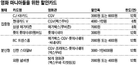 ¸Þ°¡¹Ú½º¡¤·Ôµ¥½Ã³×¸¶ µî ÁÖ¿ä ¿µÈ°üÀÌ ÆòÀÏ¿¡´Â 7000¿ø¿¡¼ 8000¿ø, ÁÖ¸»¿¡´Â 8000¿ø¿¡¼ 9000¿øÀ¸·Î °ü¶÷·á¸¦ ¿Ã·È´Ù. ¿µÈ ÇÒÀÎÄ«µå´Â ¸î ³â Àü±îÁö ¼±Ç³ÀûÀÎ Àα⸦ ²ø´Ù°¡, ½Å¿ëÄ«µåÀÇ ¿µÈ ÇÒÀÎÀÌ º¸ÆíÈµÇ¸é¼ ÀαⰡ ½ÃµéÇØÁ³´Ù. ¿µÈ ÇÒÀÎÄ«µå¸¦ ¼±ÅÃÇÒ ¶§ ¿ì¼± »ìÆìºÁ¾ß ÇÒ Ç׸ñÀº ¡ãÇÒÀÎ ¿µÈ°ü ¡ã°Ç´ç ÇÒÀÎ¾× ¡ãÃÖ´ë ÀÌ¿ë °¡´É Ƚ¼ö ¡ãµ¿Çà ÇÒÀÎ ¿©ºÎ´Ù.