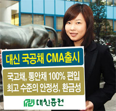 Áö³ 3¿ù Ãâ½ÃµÈ ´ë½ÅÁõ±ÇÀÇ '±¹°øÃ¤ CMA'´Â ´ëÇѹα¹¿¡¼ °¡Àå ¾ÈÁ¤¼ºÀÌ ³ôÀº ±¹Ã¤¿Í Åë¾ÈÁõ±Ç¸¸À¸·Î 100% ¿î¿ëµÈ´Ù. ±âÁ¸¿¡ ÀºÇà䳪 ȸ»çä µîÀÌ ÆíÀԵǾî ÀÖ´Â CMA¿¡ ºñÇØ ¾ÈÁ¤¼º°ú ȯ±Ý¼ºÀÌ ¶Ù¾î³ª´Ù´Â °Ô ȸ»ç Ãø ¼³¸í.
