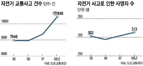 ÀÚÀü°Å ÀÌ¿ëÀÌ ´Ã¾î³ª¸é¼ ÀÚÀü°Å °ü·Ã »ç°íµµ µ¢´Þ¾Æ ±ÞÁõÇØ º¸ÇàÀÚ¿¡°Ô ½É°¢ÇÑ ºÎ»óÀ» ÀÔÈ÷´Â »ç°íµµ ½É½ÉÄ¡ ¾Ê°Ô ¹ß»ýÇϰí ÀÖ´Ù. 15ÀÏ µµ·Î±³Åë°ø´Ü¿¡ µû¸£¸é, Áö³ÇØ ÀÚÀü°Å »ç°í·Î ÀÎÇØ »ç¸ÁÇÑ »ç¶÷Àº 313¸í¿¡ ´ÞÇß´Ù. °Ç°À» À§ÇØ Åº ÀÚÀü°Å°¡ ¿ÀÈ÷·Á ¿ì¸® ¸ö¿¡ ´õ Å« »óó¸¦ ÀÔÈù °ÍÀÌ´Ù.