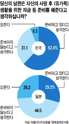 ½ÇÁ¦·Î '³²ÆíÀÌ ºÎÀÎÀ» À§ÇØ º»ÀÎ »ç¸Á ÈÄ ÇÊ¿äÇÑ ÀÚ±Ý Áغñ¸¦ ÇØÁÖ°í ÀÖ´Ù°í »ý°¢ÇÏ´À³Ä'´Â Áú¹®¿¡, Çѱ¹ ±âÈ¥¿©¼ºÀÇ 62.4%°¡ '³²ÆíÀÌ ÁغñÇϰí ÀÖ´Ù'°í ´äÇß´Ù. ÀϺ» ¿©¼ºµé(29.2%)°ú´Â ¸Å¿ì ´ëÁ¶ÀûÀÎ ¸ð½ÀÀ̾ú´Ù. ±×·¯³ª '³²Æí »çº° ÈÄ »ýȰºñ¿¡ ´ëÇØ ³²Æí°ú ´ëÈÇÑ ÀûÀÌ ÀÖ´À³Ä'´Â Áú¹®¿¡ ´ëÇØ, Çѱ¹ ¿©¼ºµéÀº '¾ø´Ù'°í ´äÇÑ ºñÀ²ÀÌ 67.8%³ª µÆ´Ù. ´ë´Ù¼ö ¿©¼ºÀº ³²ÆíÀÌ È¥ÀÚ Àß ¾Ë¾Æ¼ ÇØÁÙ °ÍÀ̶ó »ý°¢Çϰí, ³²Æí¿¡°Ô ±¸Ã¼ÀûÀ¸·Î ¾î¶»°Ô ÁغñÇϰí ÀÖ´ÂÁö ¼·Î À̾߱⸦ ³ª´©Áö ¾Ê´Â´Ù´Â ¾ê±â´Ù. ±èÀºÁ¤