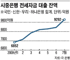 20ÀÏ ±¹¹Î¡¤½ÅÇÑ¡¤¿ì¸®¡¤Çϳª µî 4°³ ½ÃÁßÀºÇà¿¡ µû¸£¸é Áö³´Þ ¸» ÇöÀç À̵é ÀºÇàÀÇ Àü¼¼ÀÚ±Ý ´ëÃâ Àܾ×Àº 9292¾ï¿øÀÌ´Ù. ¿ù Áõ°¡¾×À» º¸¸é Áö³ 2¿ù 204¾ï¿ø¿¡¼ 7¿ù 848¾ï¿øÀ¸·Î 4¹è ÀÌ»ó ±ÞÁõÇß´Ù.