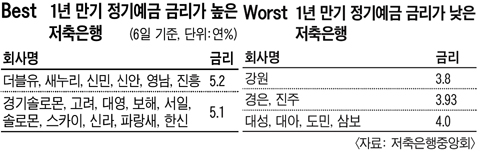 6ÀÏ ÀúÃàÀºÇàÁß¾Óȸ ȨÆäÀÌÁö¿¡ °í½ÃµÈ 1³â ¸¸±â Á¤±â¿¹±Ý ±Ý¸®´Â ´õºíÀ¯¡¤»õ´©¸®¡¤½Å¹Î¡¤½Å¾È¡¤¿µ³²¡¤ÁøÈï µî 6°³ ÀúÃàÀºÇàÀÌ ¿¬ 5.2%·Î °¡Àå ³ô¾Ò°í, ¿¬ 3.8%¸¦ ÁÖ´Â °¿øÀúÃàÀºÇàÀÌ °¡Àå ³·¾Ò´Ù.