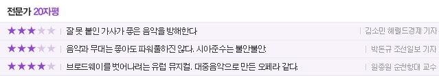 ¡¶¸ðÂ÷¸£Æ®!¡·´Â ¹«¾ùº¸´Ù Á¤¼±¾Æ¡¤¹èÇØ¼±¡¤½Å¿µ¼÷¡¤¼¹ü¼® µî °¡Ã¢·Â ÁÁÀº ¹è¿ìµéÀÌ ¹ÏÀ½Á÷½º·¯¿ü´Ù. Á¤¼±¾Æ´Â ¡¶µå¸²°ÉÁî¡· ÀÌÈÄ ÇÑÃþ ¼øµµ ³ôÀº ³ë·¡¸¦ µé·ÁÁá´Ù. ½Ã¾ÆÁؼö´Â 1¸·¿¡¼ È£ÈíÀÌ °ÅÄ¥¾ú°í ¿¬±â´Â ºÒ¾ÈÁ¤Çß´Ù. ³ë·¡ÇÒ ¶§ Àß µé¸®Áö ¾Ê´Â ´ë¸ñÀÌ ÀÖ¾ú°í ¸ö³î¸²Àº ¾î»öÇß´Ù. ÇÏÁö¸¸ 2¸·ÀÇ ¡´»ç¶ûÇÏ¸é ¼·Î¸¦ ¾Ë ¼ö°¡ À־¿¡¼ È£ÈíÀÌ Á¦ÀÚ¸®¸¦ ã¾Ò´Ù. "¾î¶»°Ô ±×¸²ÀÚ ÀÒ°í ¾î¶»°Ô ¿î¸í °ÅºÎÇØ/ ¾î¶»°Ô ¾ç½É ¹è¹ÝÇÑ Ã¤ ÀÚ±â ÀڽŠ°ÅºÎÇØ~"·Î È帣´Â ¸¶Áö¸· °î ¡´³» ¿î¸í ÇÇÇÏ°í ½Í¾î¡µ´Â Áßµ¶¼ºÀÌ °Çß´Ù.