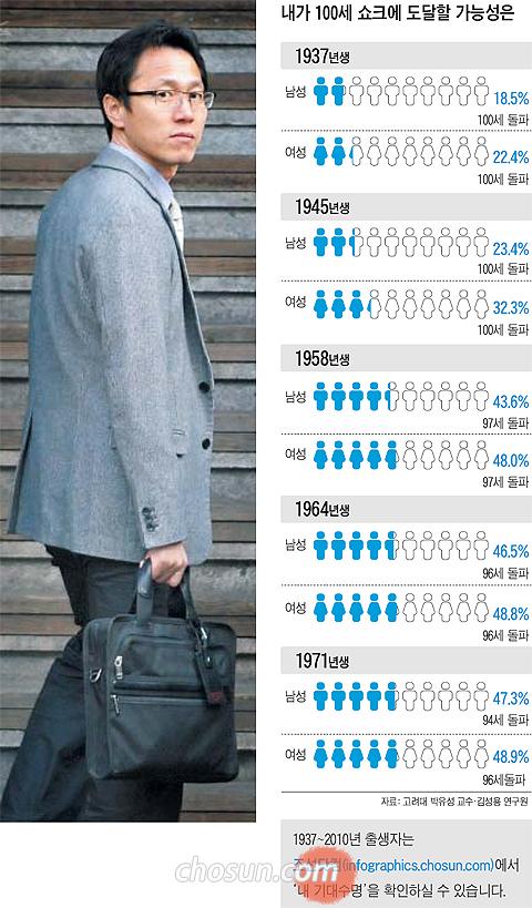 ±×·¯³ª ÀÌó·³ °è»ê ¾ø´Â ¡®°ø¹é¡¯À¸·Î ³²°ÜµÎ±â¿£ ¼ö¸íÀÌ °³ÀÎÀÇ Çູ¿¡¼ °¥¼ö·Ï Å« º¯¼ö°¡ µÇ°í ÀÖ´Ù. º»Áö°¡ ¹ÚÀ¯¼º °í·Á´ë ±³¼öÆÀ¿¡ ÀÇ·ÚÇØ Çѱ¹ÀÎÀÇ ±â´ë¼ö¸í º¯È¸¦ ¿¹ÃøÇÑ °á°ú, Àå¾¾¸¦ Æ÷ÇÔÇÑ 1971³â»ý ³²¼ºÀº ÇöÀç »ì¾ÆÀÖ´Â »ç¶÷ÀÇ Àý¹Ý(47.3%)ÀÌ 94¼¼¸¦, °°Àº ÇØ ÅÂ¾î³ ¿©¼ºÀº Àý¹Ý(48.9%)ÀÌ 96¼¼¸¦ ³Ñ±â´Â °ÍÀ¸·Î ³ªÅ¸³µ´Ù. 100¼¼ÀÎ(ìÑ)ÀÌ Èñ±ÍÇÏÁö ¾ÊÀº À̸¥¹Ù ¡®100¼¼ ¼îÅ©¡¯°¡ ¹ÚµÎÇÑ °ÍÀÌ´Ù.