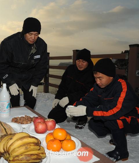 1ÀÏ ¿ÀÀü 7½Ã 57ºÐ »õÇØ ù ÇØ°¡ ¶°¿À¸£´Â ½Ã°¢¿¡ ¼ÇØ ÃÖºÏ´Ü ¹é·ÉµµÀÇ ÀåÃÌ ¾Õ¹Ù´Ù¿¡ ¸·°É¸® ÇÑ ÀÜÀÌ »Ñ·ÁÁ³´Ù. ¹é·Éµµ Åä¹ÚÀÌ Àå¼¼±¤(35)¡¤Á¶¼ºÃá(35)¡¤Àå¼¼Çö(34)¾¾ 3¸íÀÌ ¿ëƲÀÓ Àü¸Á´ë À§¿¡¼ ¸·°É¸®¿Í ºÏ¾î, »ç°ú¸¦ ¾ñÀº ´ÜÃâÇÑ Á¦»ç»óÀ» Â÷¸®°í Á¦»ç¸¦ Áö³Â´Ù. À̰÷¿¡¼± Áö³ÇØ 3¿ù õ¾ÈÇÔÀ» Áý¾î»ïÄ×´ø ¹Ù´Ù°¡ ÇÑ´«¿¡ ³»·Á´Ùº¸¿´´Ù.