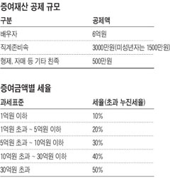 ³ª¸ÓÁö Ä£Á·°£ Áõ¿©°øÁ¦¾×Àº ÀǿܷΠ¸¹Áö ¾Ê´Ù. ÀÚ³à¿Í ¼ÕÀÚ, ¼Õ³à¿¡°Ô Àç»êÀ» ÁÙ °æ¿ì ¼º³âÀÌ¸é °øÁ¦ Çѵµ´Â 3000¸¸¿ø, ¹Ì¼º³âÀÚÀ̸é 1500¸¸¿ø¿¡ ºÒ°úÇØ ºÎºÎ °øÁ¦ Çѵµ¿Í´Â Â÷À̰¡ ¸¹´Ù. ÇüÁ¦ ÀÚ¸Å¿Í »çÀ§, ¸ç´À¸® µî ±âŸ Ä£Á· »çÀÌÀÇ Áõ¿©°øÁ¦´Â ´õ¿í Àû¾î 500¸¸¿ø±îÁö¸¸ ¼¼ ºÎ´ã ¾øÀÌ Áõ¿©°¡ °¡´ÉÇÏ´Ù. Áõ¿©¼¼´Â ¼Òµæ¼¼Ã³·³ ±Ý¾×ÀÌ ¸¹À»¼ö·Ï ¼¼À²ÀÌ ³ô¾ÆÁö´Â ´©Áø ±¸Á¶ÀÌ´Ù. 1¾ï¿ø ÀÌÇ϶ó¸é Å« ºÎ´ãÀÌ ¾ø´Â ¼öÁØ(10%)ÀÌÁö¸¸, °í¾×À» Áõ¿©ÇÏ´Â °æ¿ì¶ó¸é ½ÅÁßÈ÷ ó¸®ÇÒ Çʿ䰡 ÀÖ´Ù.