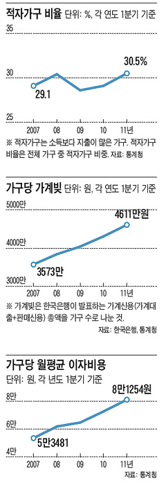 Åë°èû¿¡ µû¸£¸é 1ºÐ±â(1~3¿ù) ÀûÀÚ °¡±¸ ºñÀ²Àº 30.5%·Î Áö³ 2006³â 1ºÐ±â(30.5%) ÀÌÈÄ ÃÖ°íÄ¡¸¦ ±â·ÏÇß´Ù. ÀûÀÚ °¡±¸´Â ¼Òµæº¸´Ù ÁöÃâÀÌ ¸¹Àº °¡±¸¸¦ °¡¸®Å²´Ù. ÀûÀÚ °¡±¸µéÀÌ ¸¶À̳ʽº ÅëÀå ´ëÃâÀ» ÀÌ¿ëÇϸé¼, ÀºÇà±Ç ¸¶À̳ʽº ´ëÃâ Áõ°¡¾×Àº Áö³ 4¿ù 2000¾ï¿ø, 5¿ù 1Á¶9000¾ï¿ø µî Áõ°¡ ÆøÀÌ Ä¿Áö°í ÀÖ´Ù.