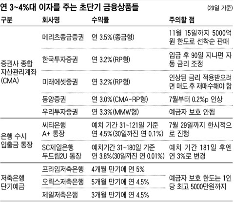 ¿äÁò °Å¾× Àڻ갡µéÀÌ ÃÖ°íÀÇ Çö±Ý Çdzó·Î ²Å´Â °÷Àº Áõ±Ç»çÀÇ Á¾ÇÕÀÚ»ê°ü¸®°èÁÂ(CMA)´Ù. ¿Ã µé¾î Çѱ¹ÀºÇàÀÌ ±âÁرݸ®¸¦ ¼¼ Â÷·Ê³ª ¿Ã¸®¸é¼ ±Ý¸®µµ ¿¬ 3%´ë ½Ã´ë¸¦ ¿¾ú´Ù. ¸Þ¸®Ã÷Á¾±ÝÁõ±ÇÀº Áö³ 15ÀÏ ÇϷ縸 ¸Ã°Üµµ ¿¬ 3.5% ÀÌÀÚ¸¦ Áִ ƯÆÇ CMA¸¦ ³»³ù´Ù. ¿¹Ä¡ ±â°£¿¡ µû¶ó ±Ý¸®°¡ °è´Ü »ó½ÂÇØ¼ ¸¶¶¥ÇÑ ÅõÀÚó¸¦ ãÁö ¸øÇØ µ·À» °è¼Ó ¸Ã°ÜµÎ¸é ÃÖ´ë ¿¬ 4.6%±îÁö ì±æ ¼ö ÀÖ´Ù. µ¿¾çÁõ±ÇÀº ´ÙÀ½ ´ÞºÎÅÍ CMA(RPÇü) ±Ý¸®¸¦ 0.2%Æ÷ÀÎÆ® ÀλóÇØ ¿¬ 3.2%¸¦ Àû¿ëÇÑ´Ù. ¹Ì·¡¿¡¼ÂÁõ±Çµµ Áö³ 15ÀÏ CMA ±Ý¸®¸¦ ±âÁ¸ 3%¿¡¼ 0.2%Æ÷ÀÎÆ® ¿Ã·Á ¿¬ 3.2%¸¦ ÁÖ°í ÀÖ´Ù. À±ÇÑÈ£ ¹Ì·¡¿¡¼ÂÁõ±Ç Â÷ÀåÀº "RP(ȯ¸ÅÁ¶°ÇºÎä±Ç)Çü CMAÀÇ °æ¿ì¿£ µ·À» ÀÏ´Ü ¸ÅµµÇÑ ÈÄ Àç¸Å¼öÇÏ´Â ÀýÂ÷¸¦ °ÅÃľ߸¸ ÀλóµÈ ±Ý¸®¸¦ Àû¿ë¹ÞÀ» ¼ö ÀÖ´Ù"°í ¸»Çß´Ù.