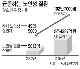 Çѱ¹º¸°Ç»çȸ¿¬±¸¿ø ±èÁø¼ö ¿¬±¸À§¿øÀº 'º¸°Çº¹Áö À̽´&Æ÷Ä¿½º' ÃÖ±ÙÈ£(25ÀÏÀÚ)¿¡ ¹ßÇ¥ÇÑ º¸°í¼¿¡¼ 2002³â 49¸¸9000¸íÀÌ´ø ³ëÀμº ÁúȯÀÚ°¡ 2009³â 102¸¸7000¸íÀ¸·Î Å©°Ô ´Ã¾î³µ´Ù°í ¹àÇû´Ù.