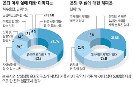 ÀºÅð ±â°£À» ±×³É Áý¿¡¼ ¹¶°³°Ú´Ù´Â »ç¶÷Àº ¸¹Áö ¾Ê¾Ò´Ù. ÁÖµÈ Á÷Àå¿¡¼ ÅðÁ÷Çϸé ÀÏÀ» ÇÏÁö ¾Ê°Ú´Ù´Â ÀÀ´äÀÚ´Â ÀüüÀÇ 7%¿¡ ºÒ°úÇß´Ù. ³ª¸ÓÁö 93%´Â ÀºÅð ÈÄ¿¡µµ ¾î¶² ÇüÅ·εç ÀÏÀ» ÇÏ°Ú´Ù°í ¹àÇû´Ù. ÀÏÀ» ÇÏ·Á´Â ÀÌÀ¯´Â ÀھƽÇÇö¡¤º¸¶÷ÀÌ 51%·Î °¡Àå ¸¹°í, Àç¹Ì(23.2%), µ·(16.2%)ÀÇ ¼øÀ̾ú´Ù. ÇÏÁö¸¸ ÀºÅð ÈÄ 40³âÀ» ¹à°Ô ±×¸®´Â µ¥ ºñÇØ ÀºÅð Áغñ´Â ÃæºÐÇÏÁö ¾Ê¾Ò´Ù. 'ÀºÅð Èĸ¦ »ý°¢ÇØ º» ÀûÀº ÀÖÁö¸¸ °èȹÀ» ¼¼¿ö º» ÀûÀº ¾ø´Ù'(31.6%)´Â ÀÀ´äÀÌ °¡Àå ¸¹¾Ò´Ù. ÀºÅð ÈÄ¿¡ ´ëÇØ ¾Æ¿¹ »ý°¢ÇØ º» ÀûÀÌ ¾ø´Ù´Â ÀÀ´äµµ 20%¿´´Ù.