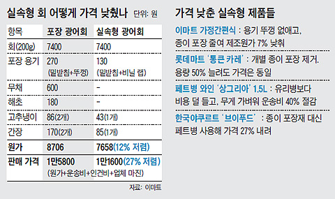 ÀÌÀ¯´Â °ªÀ» ³·Ãè±â ¶§¹®Àε¥, ÀÎÇÏ ºñ°áÀÌ Èï¹Ì·Ó´Ù. 100g´ç 5800¿ø¿¡ ÆÇ¸ÅÇÏ´Â ½Ç¼ÓÇü ȸ´Â ±âÁ¸¿¡ ÆÇ¸ÅÇÏ´ø ÀÏ¹Ý È¸ »óǰº¸´Ù 27% Á¤µµ ½Î´Ù. À̸¶Æ®´Â »óǰÀÇ 'ÇÙ½É'ÀÎ »ý¼±È¸ ÀÌ¿ÜÀÇ '°ç´Ù¸®' ǰ¸ñÀ» ¾ø¾Ö ¿ø°¡¸¦ ³·Ãè´Ù. »ý¼±È¸ ¹Ø¿¡ Àå½Ä¿ëÀ¸·Î ±ò´ø ¹«Ã¤¿Í ¸¶¸¥ ÇØÃʸ¦ ¾ø¾Ý´Ù. Åõ¸í ÇÃ¶ó½ºÆ½ ¶Ñ²± ´ë½Å ºñ´Ò ·¦À» ¾º¿ü´Ù. ȸ¿Í ÇÔ²² 2°³¾¿ µé¾î ÀÖ´ø °íÃß³ÃÀÌ¿Í °£ÀåÀº °¢°¢ 1°³·Î ÁÙ¿´´Ù. ¿î¼Ûºñ¿Í ÀΰǺñ, ¾÷ü ¸¶ÁøÀ» »« ±¤¾îȸ 200gÀÇ ¿ø°¡¸¦ °è»êÇØº¸´Ï 7658¿ø. ±âÁ¸¿¡ ÆÇ¸ÅÇÏ´ø Æ÷Àå¿ë ±¤¾îȸ ¿ø°¡(8706¿ø)º¸´Ù 12% Á¤µµ Àú·ÅÇß´Ù.