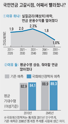 ±¹È¸¿¹»êÁ¤Ã¥Ã³(ÀÌÇÏ Á¤Ã¥Ã³)´Â ±¹¹Î¿¬±ÝÀÌ »¡¸® °í°¥µÇ´Â ¿øÀÎÀ» ¿¬±Ý ¼öÀÔ°ú ÁöÃâ Áõ°¡ÀÇ ¼Óµµ Â÷ÀÌ·Î ¼³¸íÇÑ´Ù. 2012~2070³â Æò±ÕÀ» ³»¸é ¿¬±ÝÁöÃâÀº ¸Å³â 7%¾¿ ´ÃÁö¸¸, ¿¬±Ý Àû¸³±Ý°ú ¿î¿ë ¼öÀÍÀ» ÇÕÄ£ ¿¬±Ý ¼öÀÔÀº 2.5%¾¿ ´Ã¾î³ª´Â µ¥ ±×Ä¥ °ÍÀ̶ó´Â °Ô Á¤Ã¥Ã³ °üÃøÀÌ´Ù. ÁöÃâÀº »¡¸® ´Ã°í, ¼öÀÔÀº ´õµð°Ô ´À´Ï Àç¿øÀÌ ¹Ù´Ú³¯ ¼ö¹Û¿¡ ¾ø´Ù. ÀÌ ³í¸®´Â Áö³ 2008³â ±¹¹Î¿¬±ÝÀÌ ÀÚüÀûÀ¸·Î À§¿øÈ¸¸¦ ¸¸µé¾î ÃßÁ¤ÇÑ °á°ú "2060³âÀÌ¸é °í°¥µÉ °Í"À̶ó°í ÆÇ´ÜÇÑ ±Ù°Å¿Í °°´Ù.