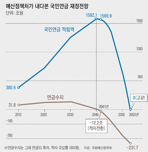 ±¹È¸¿¹»êÁ¤Ã¥Ã³´Â ÃÖ±Ù '2012~ 2060³â Àå±â ÀçÁ¤Àü¸Á ºÐ¼®'ÀÚ·á¿¡¼ "¿¬±Ý °í°¥ ½ÃÁ¡ÀÌ ±¹¹Î¿¬±ÝÀÌ °è»êÇÑ °Íº¸´Ù 7³â »¡¶óÁ® 2053³â¿¡ °í°¥µÉ °Í"À̶ó°í ¹àÇû´Ù. ÇöÀç 24»ì û³âÀÌ ¿¬±ÝÀ» ¹ÞÀ» ½ÃÁ¡(¸¸ 65¼¼)¿¡´Â ÀÌ¹Ì ±¹¹Î¿¬±ÝÀÌ ¹Ù´ÚÀ» µå·¯³»°í ¾Æ¹«°Íµµ ³²¾ÆÀÖÁö ¾Ê´Ù´Â ¾ê±â´Ù. ±¹¹Î¿¬±Ý ÀûÀÚ°¡ ½ÃÀ۵Ǵ ½Ã±âµµ 2041³âÀ¸·Î ´çÃÊ ¿¹»óº¸´Ù 3³â ´õ »¡¶óÁ³´Ù.