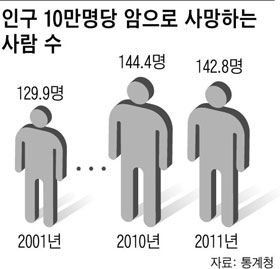 ÇÏÁö¸¸ ¾Ï ¹ß»ý·üÀº ÇØ¸¶´Ù ´Ã°í ÀÖ´Ù. 2001³â Àα¸ 10¸¸¸í´ç ¾Ï ¹ß»ýÀÚ ¼ö°¡ 232¸íÀÌ´ø °ÍÀÌ 2009³â¿¡´Â 388¸íÀ¸·Î Ä¡¼Ú¾Ò´Ù. 10³â µ¿¾È µÎ ¹è °¡±îÀÌ·Î ´Ã¾ú´Ù. ³ªÀ̰¡ µé¼ö·Ï ³ëÈ Çö»óÀ¸·Î ¾Ï ¹ß»ýÀÌ ´Ã¾î³ª±â ¶§¹®ÀÌ´Ù.