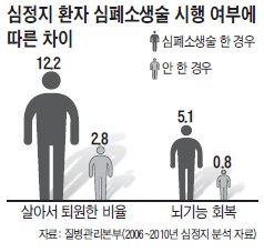 Áúº´°ü¸®º»ºÎ°¡ ÃÖ±Ù °ø°³ÇÑ 2006~2010³â ½ÉÁ¤Áö ºÐ¼® º¸°í¼¸¦ º¸¸é, ±× Â÷À̰¡ ½ÉÁ¤Áö ȯÀÚÀÇ »ýÁ¸À²À» 4.4¹è ³ô¿´´Ù. ÀÌ ±â°£ Àü±¹¿¡¼ ½ÉÁ¤Áö°¡ ¹ß»ýÇØ ±¸±ÞÂ÷·Î ÀÀ±Þ½Ç¿¡ ½Ç·Á¿Â 9¸¸7291¸íÀ» ºÐ¼®ÇÑ °á°ú, ÀϹÝÀÎ ¸ñ°ÝÀÚ¿¡ ÀÇÇØ ½ÉÆó¼Ò»ý¼úÀÌ ÀÌ·ïÁø °æ¿ì »ì¾Æ¼ Åð¿øÇÑ ºñÀ²ÀÌ 12.2%¿´´Ù. ¾Æ¹«·± Á¶Ä¡¸¦ ¹ÞÁö ¾ÊÀº ȯÀÚ ±×·ìÀº 2.8%¸¸ÀÌ »ýÁ¸ÇØ Åð¿øÇß´Ù.