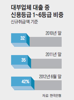 ÀºÇà ¹®ÅÎÀÌ ³ô´Ù º¸´Ï ½Å¿ëµî±ÞÀÌ ÁÁÀº »ç¶÷µµ ¿¬ 39%ÀÇ °í±Ý¸®¸¦ °¨¼öÇÏ°í ´ëºÎ¾÷ü¸¦ ÀÌ¿ëÇÏ´Â °æ¿ì°¡ ÀûÁö ¾Ê´Ù. Çѱ¹ÀºÇàÀÌ ±¹È¸¿¡ Á¦ÃâÇÑ '±ÝÀ¶¾ÈÁ¤º¸°í¼'¿¡ µû¸£¸é ´ëºÎ¾÷üµéÀÌ 1~6µî±Þ ´ëÃâÀÚ¿¡°Ô ºô·ÁÁØ ºñÁß(½Å±Ô Ãë±Þ¾× ±âÁØ)ÀÌ ¿ÃÇØ »ó¹Ý±â 42%·Î Áý°èµÆ´Ù. 2010³â(32%), 2011³â(35%)¿¡ ºñÇØ Å©°Ô »ó½ÂÇÑ °ÍÀÌ´Ù.