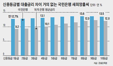 ¹®Á¦´Â ÀϺΠÀºÇàÀº »õÈñ¸ÁȦ¾¾ ´ëÃâ¿¡¼ ½Å¿ëµî±ÞÀÌ ³ôÀº »ç¶÷¿¡°Ôµµ ¶È°°ÀÌ ³ôÀº ±Ý¸®¸¦ Àû¿ëÇϰí ÀÖ´Ù´Â Á¡ÀÌ´Ù. ±¹¹ÎÀºÇàÀº ½Å¿ëµî±Þ 1µî±Þ ´ëÃâÀÚ¿¡°Ô ¿¬ 12.7%(Æò±ÕÄ¡)ÀÇ ±Ý¸®¸¦ Àû¿ëÇß´Ù. ºÎ»êÀºÇàÀÇ 1µî±Þ ´ëÃâÀÚ Æò±Õ ±Ý¸®°¡ 7.2%Àε¥, ±¹¹ÎÀºÇàÀº À̺¸´Ù 5.5%Æ÷ÀÎÆ® ³ôÀº °ÍÀÌ´Ù. »õÈñ¸ÁȦ¾¾ Æò±Õ ´ëÃâ¾×ÀÌ 1000¸¸¿ø Á¤µµÀε¥, °°Àº ½Å¿ëµî±ÞÀÌ¶óµµ ±¹¹ÎÀºÇà ´ëÃâÀÚ´Â ºÎ»êÀºÇà¿¡¼ ºô¸° °æ¿ìº¸´Ù 1³â¿¡ 55¸¸¿ø ÀÌÀÚ¸¦ ´õ ³»´Â ¼ÀÀÌ´Ù. ±¹¹ÎÀºÇàÀÇ °æ¿ì ½Å¿ëµî±Þ 1µî±Þ°ú 10µî±ÞÀÇ ´ëÃâ±Ý¸® Â÷À̰¡ 0.8%Æ÷ÀÎÆ®¹Û¿¡ ³ªÁö ¾Ê¾Ò´Ù. ²¿¹Ú²¿¹Ú ºúÀ» ¼º½ÇÇÏ°Ô °±¾Æ ½Å¿ëµî±ÞÀ» ¿Ã·Á³õÀº ´ëÃâÀÚ ÀÔÀå¿¡¼± ÀÌÇØ°¡ °¡Áö ¾Ê´Â Â÷ÀÌÀÌ´Ù.