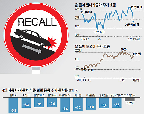 ÀÚµ¿Â÷ÁÖ(ñ»)ÀÇ ÁÖ°¡ È帧ÀÌ ½É»óÄ¡ ¾Ê´Ù. Áö³ÇØ Çö´ëÀÚµ¿Â÷¿Í ±â¾ÆÀÚµ¿Â÷´Â ¹Ì±¹¿¡¼ ¿¬ºñ °úÀå ±¤°í¸¦ ÇØ ÁÖ°¡¿¡ Ÿ°ÝÀ» ¹Þ¾Ò´Âµ¥, ¿ÃÇØ µé¾î¼± ¿£Àú(î¸)¿Í '¸®ÄÝ »çÅÂ'¶ó´Â ¾ÇÀç±îÁö °ãÃÆ´Ù.