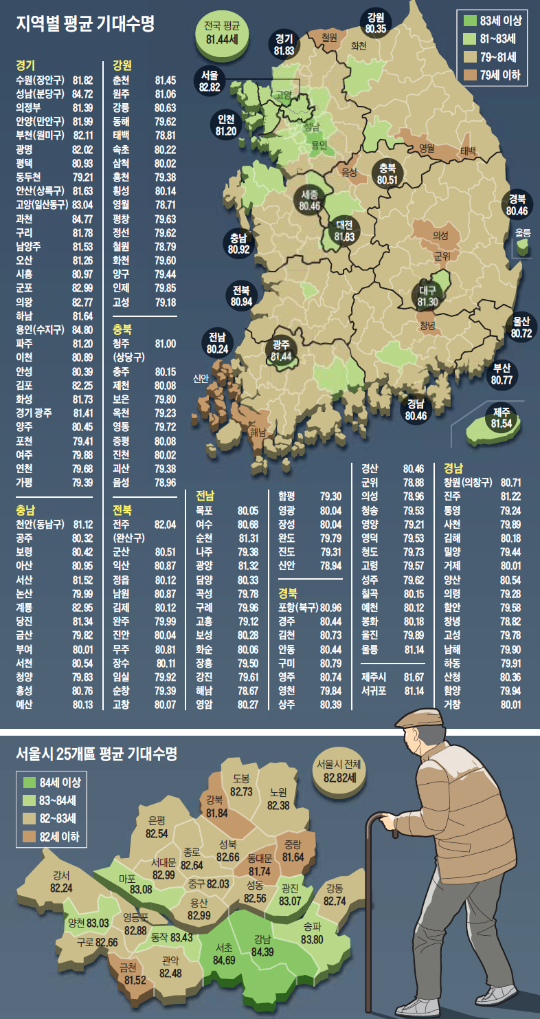 ½Ã¡¤±º¡¤±¸·Î º¸¸é ÈõÀº °í¼ÒµæÃþ(83¼¼)°ú ¼Òµæ ÇÏÀ§Ãþ(71¼¼) °£ ±â´ë¼ö¸í Â÷°¡ 12³âÀ̳ª µÇ´Â ¹Ý¸é, °æ±â ¿ëÀνà ¼öÁö±¸´Â 1.8¼¼¿¡ ºÒ°úÇÑ °ÍÀ¸·Î ³ªÅ¸³µ´Ù. ÀÌó·³ ³óÃÌÁö¿ªÀÌ ±â´ë¼ö¸í Â÷À̰¡ Å« ¹Ý¸é ¼¿ï¡¤°æ±â µî ¼öµµ±Ç ½Ã¡¤±º¡¤±¸´Â °ÝÂ÷°¡ Àû¾ú´Ù.