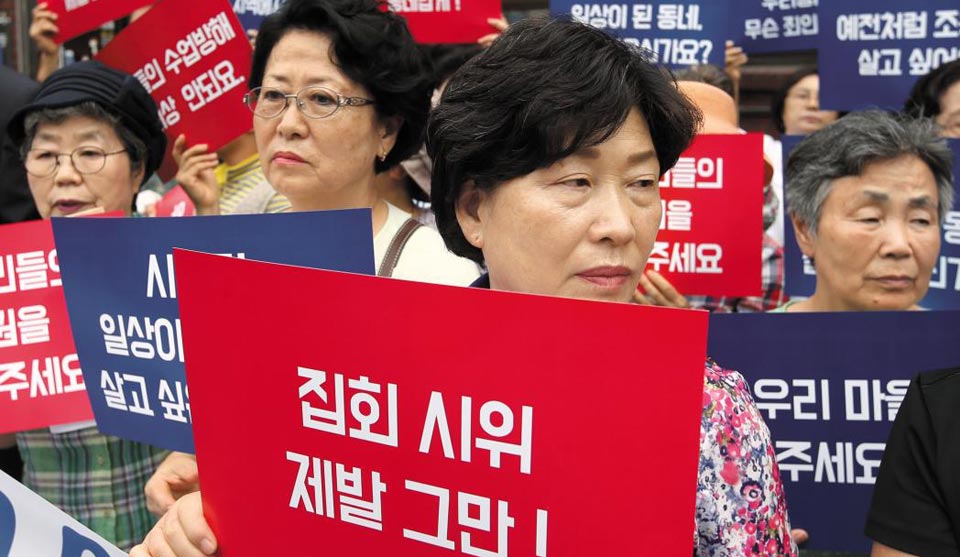 È£¼Ò¹® ³¶µ¶À» ¸¶Ä£ ÁֹεéÀº Áֹμ¾ÅÍ ¾Õ »ç°Å¸®¿¡ ¼¼ ¼ÕÆÖ¸»À» µé¾ú´Ù. ±¸È£´Â ¿ÜÄ¡Áö ¾Ê¾Ò´Ù. ÁֹεéÀº ¾à 30ºÐ°£ 'Á¶¿ëÇÑ ½ÃÀ§'¸¦ À̾´Ù. ÁÖ¹Îµé ¾Õ¿¡´Â µÎ ´Þ¿© Àü¿¡ ¹Î³ëÃÑ ±Ý¼Ó³ëÁ¶°¡ Àεµ(ìÑÔ³)¿¡ Ä£ ºÒ¹ý õ¸·ÀÌ ÀÖ¾ú´Ù. õ¸· ¾È¿¡ ÀÖ´ø ³ëÁ¶¿ø 1¸íÀÌ ³ª¿Í "¿ì¸®µµ Áýȸ ½Å°íÇϰí Á¤´çÇÏ°Ô Áýȸ ÁßÀÌ´Ï ¹æÇØÇÏÁö ¸¶¶ó"°í ¼Ò¸®ÃÆ´Ù. û¿îµ¿¿¡ 46³â° »ì°í ÀÖ´Â ¹Úº¹¼ø(70)¾¾´Â "¿Ö ÀÚ±âµé ±Ç¸®´Â ÁÖÀåÇÏ¸é¼ ¿ì¸®°¡ Á¶¿ëÈ÷ ½¯ ±Ç¸®´Â »ý°¢ ¸ø ÇÏ´À³Ä"°í Çß´Ù. ´ëÃ¥À§´Â ¿À´Â 9¿ù ¼¿ïÇàÁ¤¹ý¿ø¿¡ Áýȸ°¡ °¡´ÉÇÑ ½Ã°£°ú ¼ÒÀ½À» ±ÔÁ¦Çϵµ·Ï °¡Ã³ºÐ ½ÅûÀ» ³¾ °èȹÀÌ´Ù. Áֹμ¾ÅÍ °ü°èÀÚ´Â "Âü¾Ò´ø ÁֹεéÀÌ ÇѰ迡 ´Ù´Ù¶ú´Ù. °¡´ÉÇÑ ¹ýÀû¡¤ÇàÁ¤Àû Á¶Ä¡¸¦ ÇØ¼ Á¶¿ëÇÑ µ¿³×¸¦ µÇãÀÚ´Â µ¥ ¶æÀÌ ¸ð¾ÆÁø °Í"À̶ó°í Çß´Ù.
